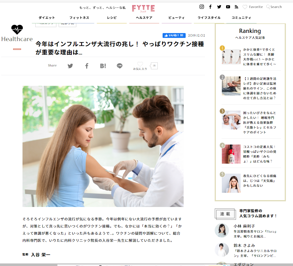 2019年12月 インフルエンザについて取材を受けました。 『今年はインフルエンザ大流行の兆し!やっぱりワクチン接種は重要な理由は…』 インフルエンザワクチンについてお話しています。 こちらからご覧ください。 FYTTE healthcare