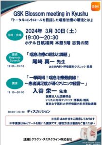 3月30日(土)、グラクソ・スミスクライン株式会社主催「GSK Blossom meeting in Kyushu」の『トータルコントロールを目指した喘息治療の潮流とは』にて院長が講演しました。 「一挙両得!喘息治療最前線!~患者満足度が導くクリニック経営~」というテーマでお話しました。 (文責 福田)