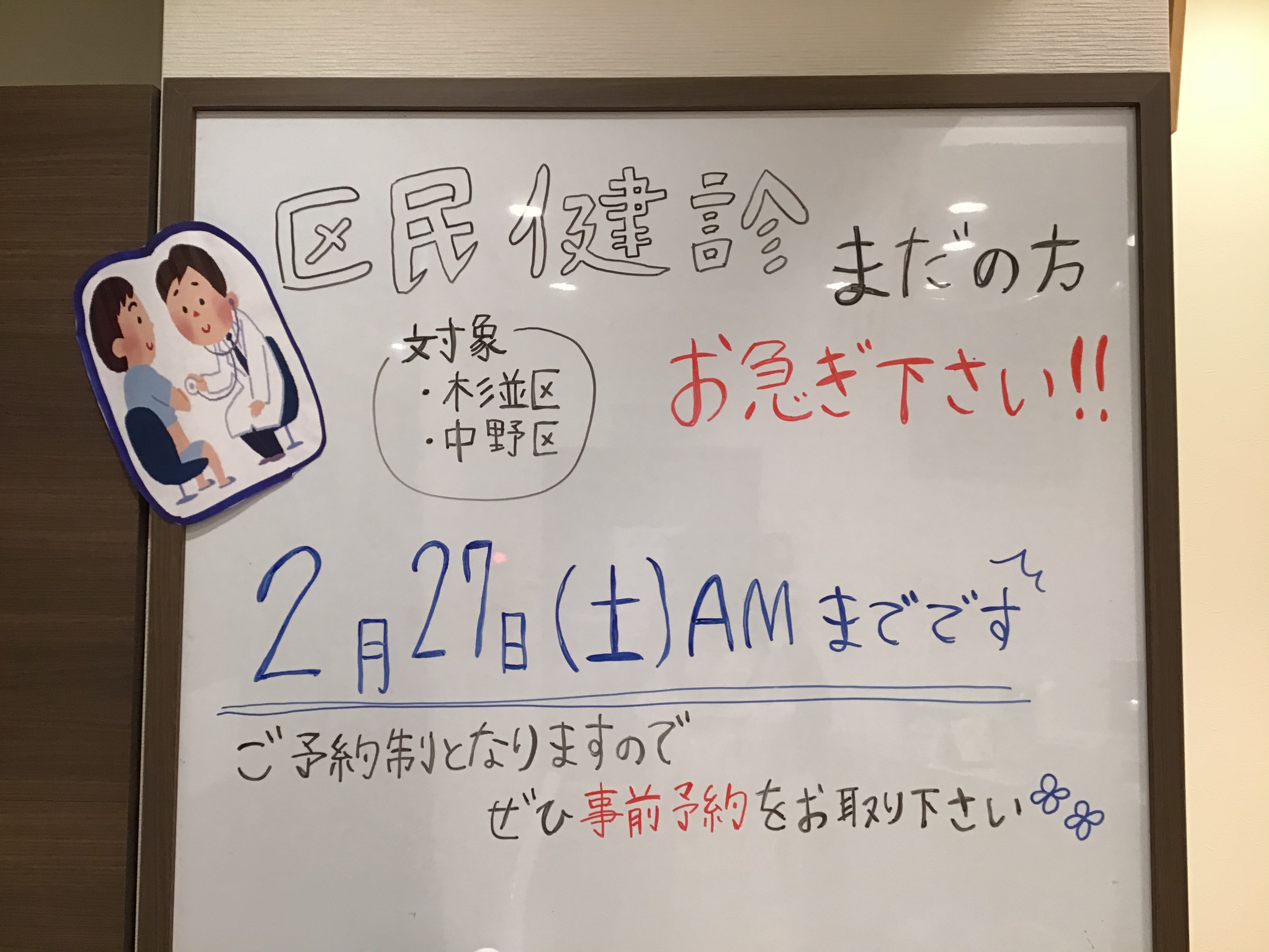 当院では杉並区・中野区の区民健診を実施しております。今年度の受診期限は ★2月27日(土)★ までです。