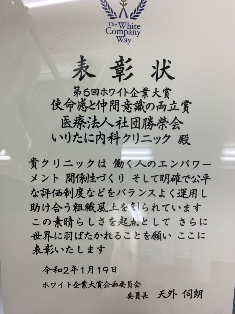 なんと、当院、ホワイト企業大賞の特別賞を受賞することができました‼‼‼ 特別賞、その名も、 【使命感と仲間意識の両立賞】です!! ホワイト企業大賞って何…?という方も多いと思いますので、説明を少し。 この賞は、ホワイト企業大賞企画委員会が主催しているもので、 当院は2019年、第6回ホワイト企業大賞にエントリーいたしました。 ホワイト企業大賞企画委員会は、 ホワイト企業 = 社員の幸せと働きがい、社会への貢献を大切にしている企業 と定めています。 ホワイト企業大賞公式HP 表彰企業のページに当院が載っています♪ http://whitecompany.jp/whitecompany/ 私たちのクリニックの経営理念は「関わる人すべてに安心と幸せを届ける企業であり続けます」です。 この、関わる人の中には、患者様はもちろん、私たちスタッフのことも含まれているのだと、 いつも院長は伝えてくださっています。 まだまだ発展途上、理想を追い求めて走り続けている段階ですので、 正直なところ、すべてが整っているわけではありません。 それでも、目指すところは「関わる人の安心と幸せ」、 それに向かって試行錯誤しながら歩み続けている…というところを評価していただいたのではないか、 と勝手に解釈しております。