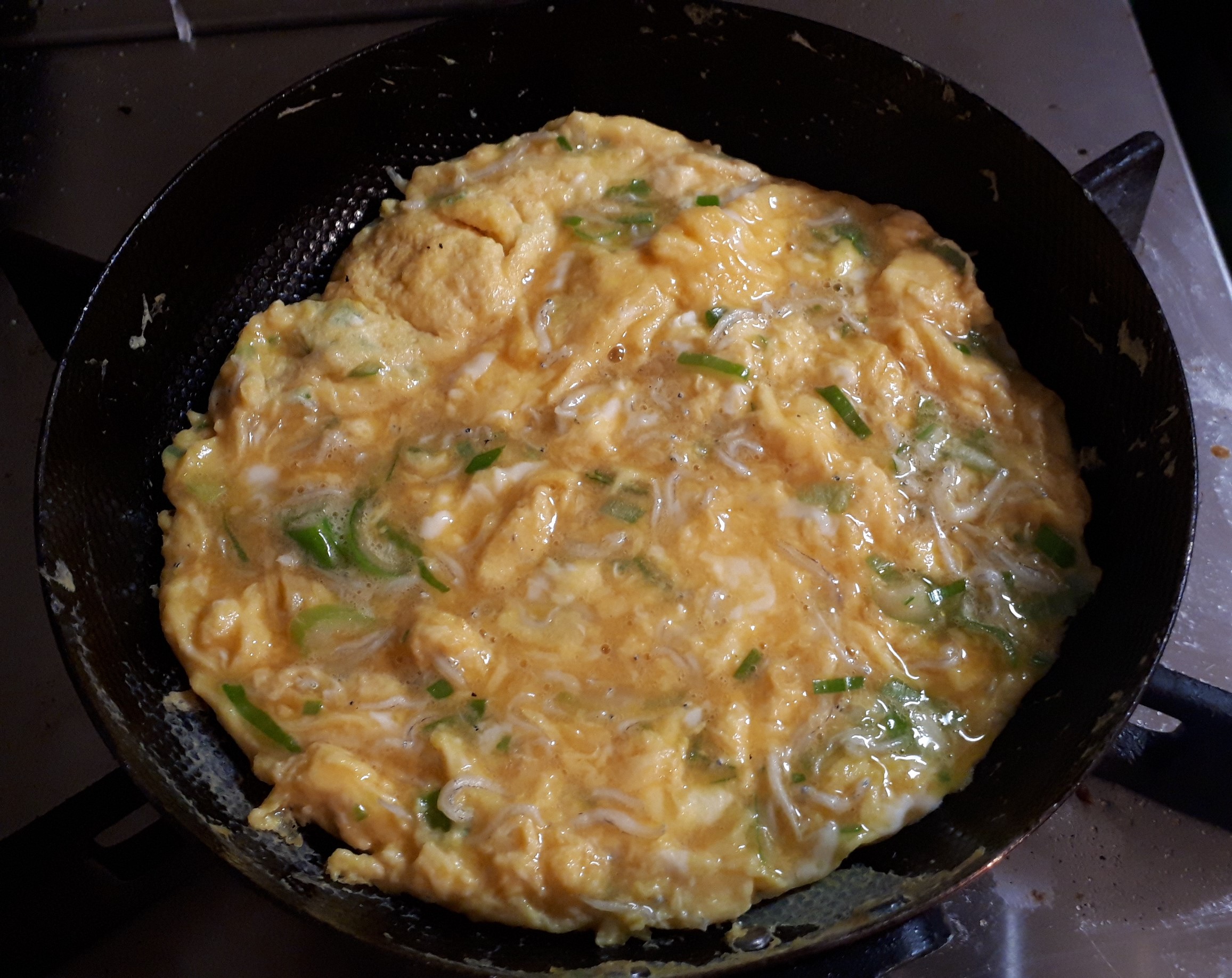 ③フライパンに①を全量流し入れます。 すぐ混ぜたいと思ってしまうけど、一呼吸。