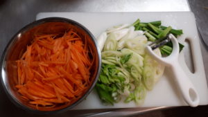 ④火力を強し、人参・ニラ・調味料を入れさっと炒めます。
